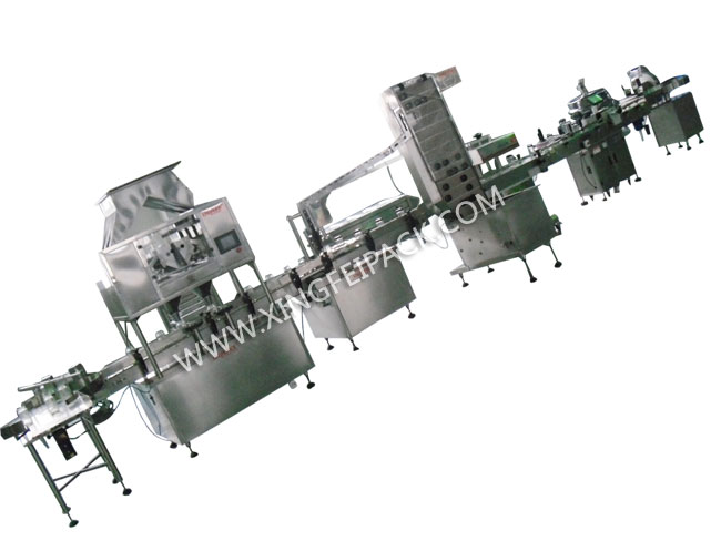顆粒灌裝生產(chǎn)線用于顆粒物料的瓶裝和罐裝,瓶裝線包含供瓶-稱重灌裝-旋蓋 –貼標-鋁箔封口-收瓶, 罐裝線包含,供瓶-稱重灌裝-封罐-噴碼-收瓶, 具體可按照要求定制。